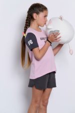 • The t-shirt has a round neckline, is slightly longer at the back, and is decorated with a print.