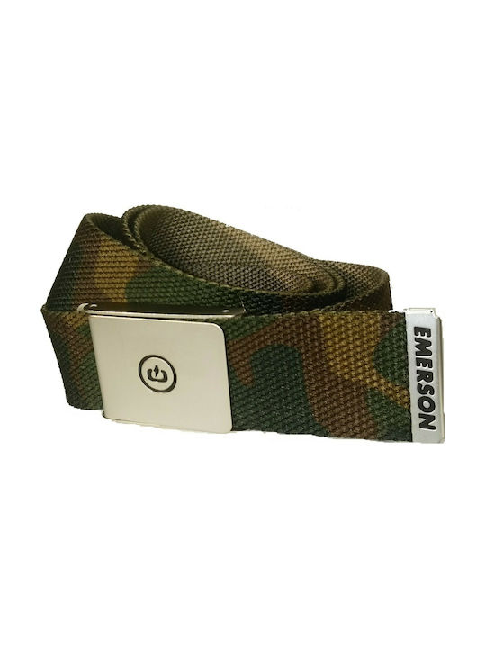 EMERSON logo on the buckle and the metal tip at the end. Made with cotton blend fabric