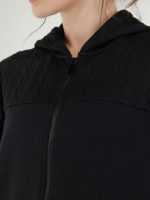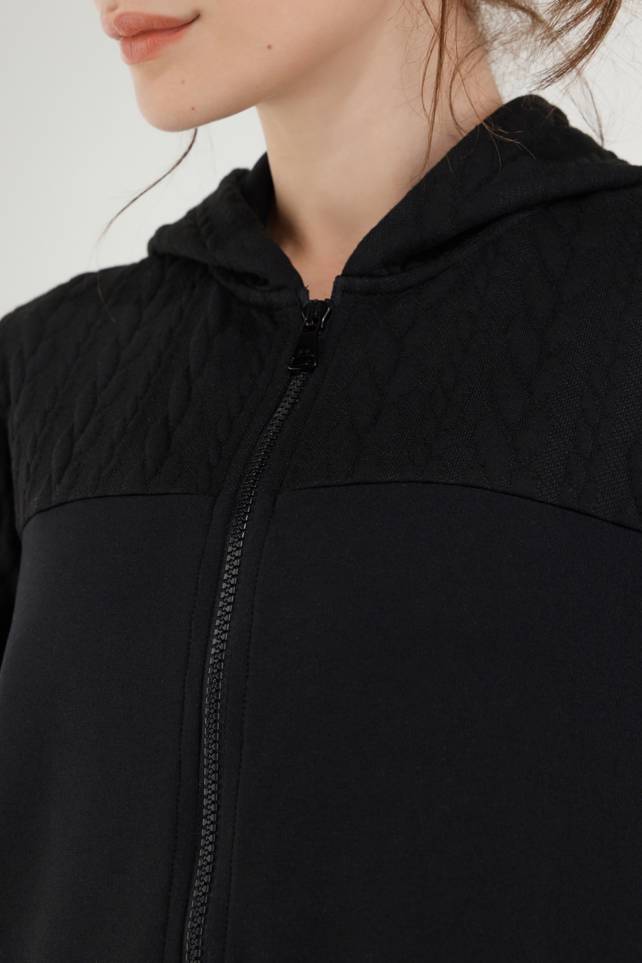 - Fabric with cable effect on the outside of the hood, the yoke, and the sleeves