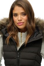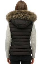 - Γιλέκο padded καπιτονέ, με ψηλό λαιμό, κουκούλα με κορδόνι προσαρμογής και αποσπώμενη συνθετική γούνα & κλείσιμο μπροστά με φερμουάρ. Δύο τσέπες στο πλάι με φερμουάρ & ετικέτα logo Superdry στο τελείωμα.